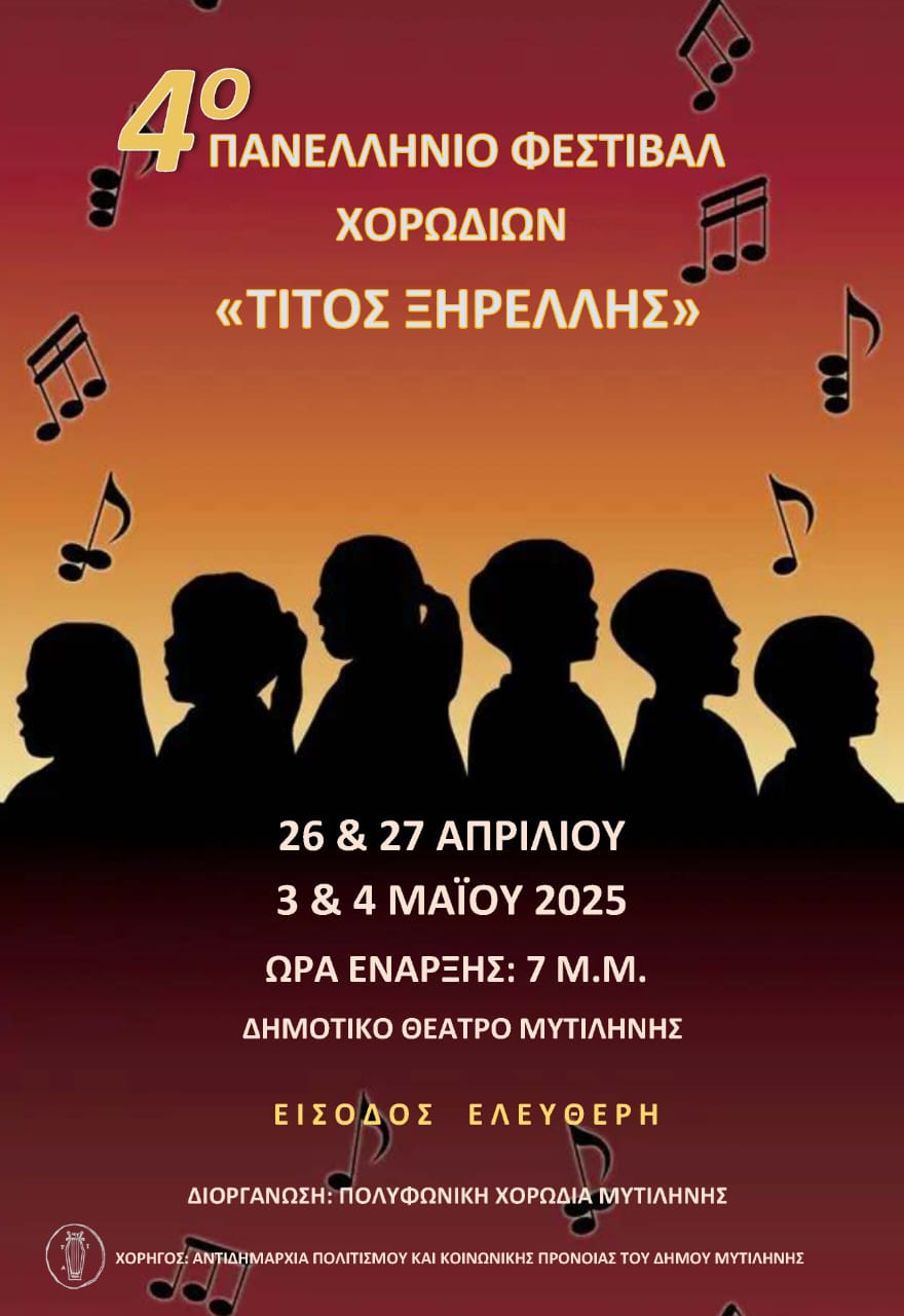 Mytilene Municipality Theater Π. Κουντουριώτου 3 81100, Μυτιλήνη, Greece4o Πανελλήνιο Φεστιβάλ Χορωδιών Τίτος Ξηρέλης
