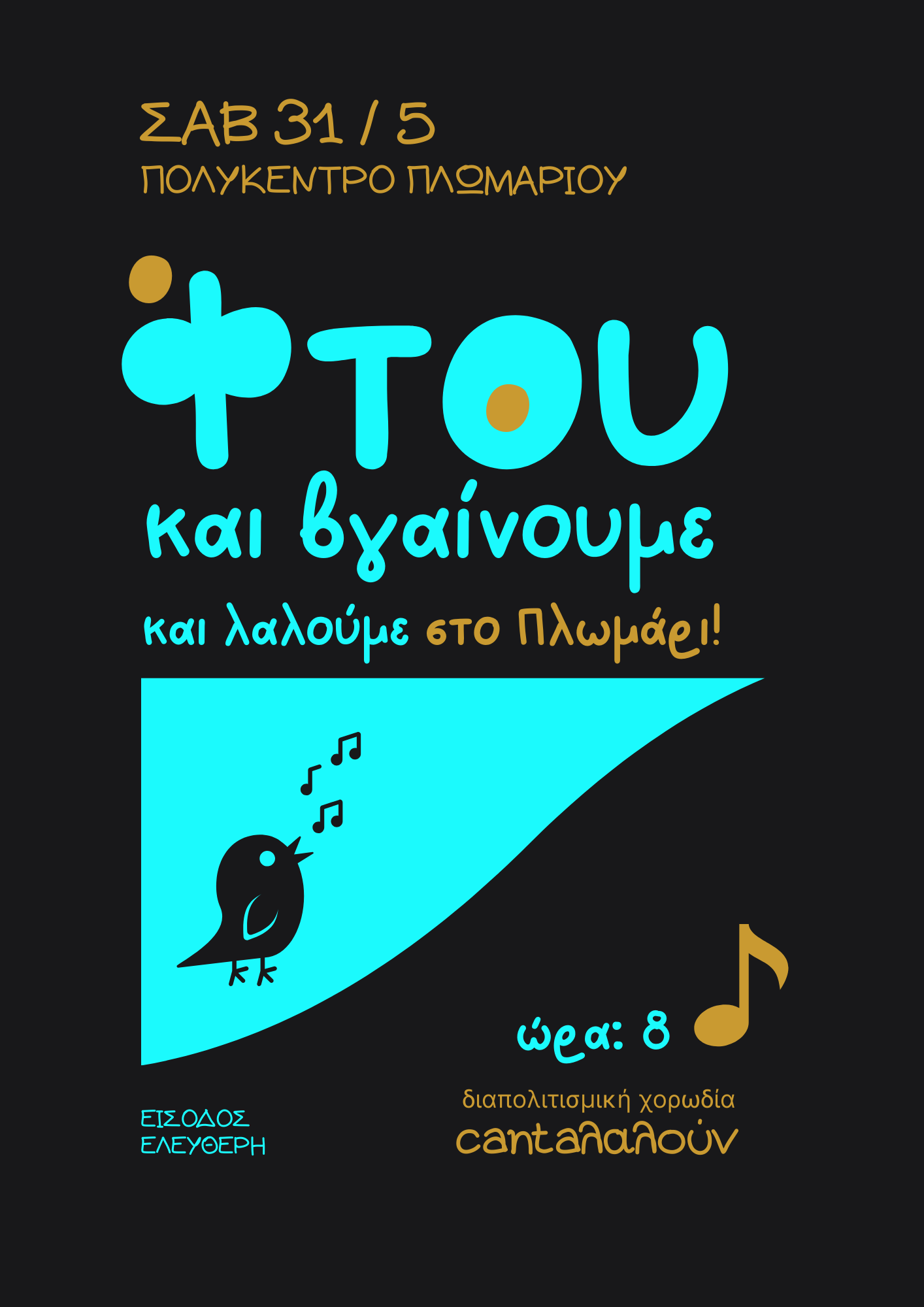Plomari Town Plomari, Lesvos, Greece31/5 στις 20.00 τραγουδάμε στο Πλωμάρι Τίτλος συναυλίας : "Φτου και βγαίνουμε και λαλούμε στο Πλωμάρι!" Συναυλία της διαπολιτισμικής χορωδίας CANTAλαλούν DOWNLOAD EVENT POSTER PDF PRINT QUALITY HERE